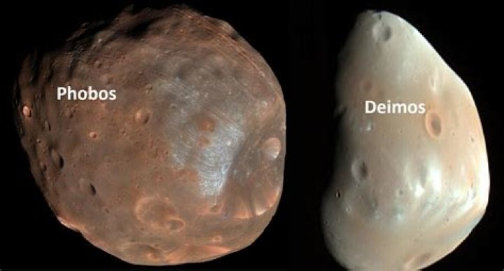 Phobos and Deimos bear more resemblance to asteroids than to Earth's moon. Both are tiny — the larger, Phobos, is only 14 miles across (22 kilometers), while the smaller, Deimos, is only 8 miles (13 km), making them some of the smallest moons in the solar system.