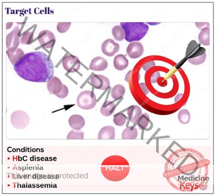 Presence of cells called target cells may be due to: Deficiency of an enzyme called lecithin cholesterol acyl transferase. Abnormal hemoglobin, the protein in RBCs that carries oxygen (hemoglobinopathies) Iron deficiency. Liver disease.