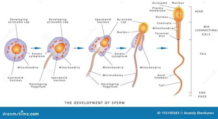 The mature sperm cell (spermatozoa) is 0.05 milliliters long. It consists of a head, body and tail. The head is covered by the ac cap and contains a nucleus of dense genetic material from the 23 chromosomes.
