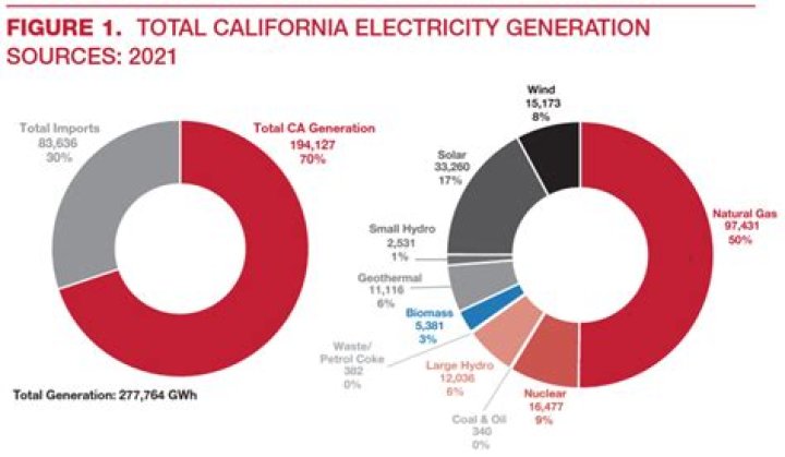 The imports were 40 TWh from Pacific Northwest and 46 TWh from the southwest, the latter including 20 TWh from coal and gas. Peak electricity demand in 2017 was 50 GWe. In 2018, almost one-third of California's electricity supply came from outside the state.