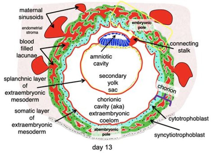The extra-embryonic coelom develops at the same time as the primitive yolk sac through the proliferation and differentiation of hypoblast cells into mesenchymal cells that fill the area between Heuser's membrane and the trophoblast. The entire structure is enclosed by the chorionic plate.