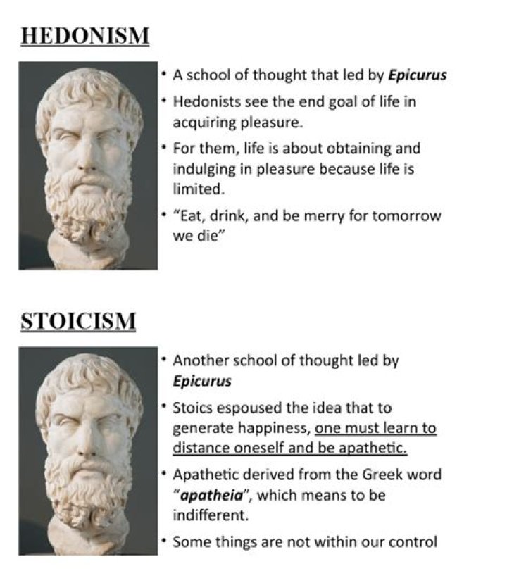 Stoicism vs Hedonism: the distinction. When comparing stoicism vs hedonism, the most important distinction is based on the idea of pleasure. In stoicism, pleasure is perceived as neither 'good' nor 'bad', but rather something to view indifferently. In hedonism, one's focus is largely set on the pursuit of pleasure.