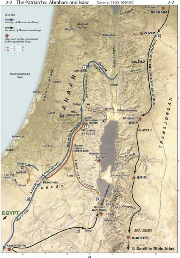 Genesis 20:1–16 narrates the story of Abraham emigrating to the southern region of Gerar, whose king is named Abimelech. Abraham states that Sarah, his wife, is really his sister, leading Abimelech to try to take Sarah as a wife; however, God intervened before Abimelech touched Sarah.