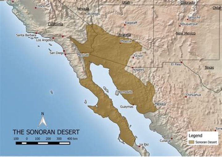 The Sonoran Desert as currently defined covers approximately 100,000 square miles (260,000 sq. km.) and includes most of the southern half of Arizona, southeastern California, most of the Baja California peninsula, the islands of the Gulf of California, and much of the state of Sonora, Mexico.