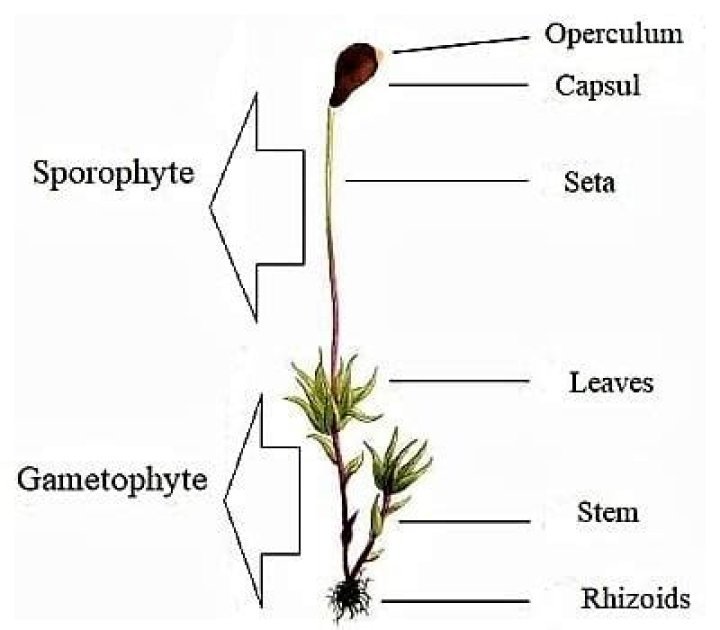 page noted that bryophytes have a gametophyte stage and a sporophyte stage. The spore capsule, often with a supporting stalk (called a seta), is the sporophyte and this grows from the gametophyte stage. You will commonly see the statement that a moss gametophyte consists of leaves on stems.