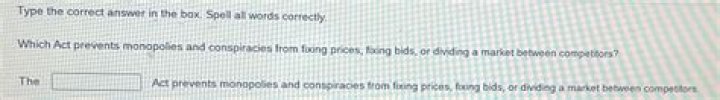 The Sherman Act, or Sherman Antitrust Act, prevents monopolies and conspiracies from fixing prices, fixing bids, or dividing a market between competitors.