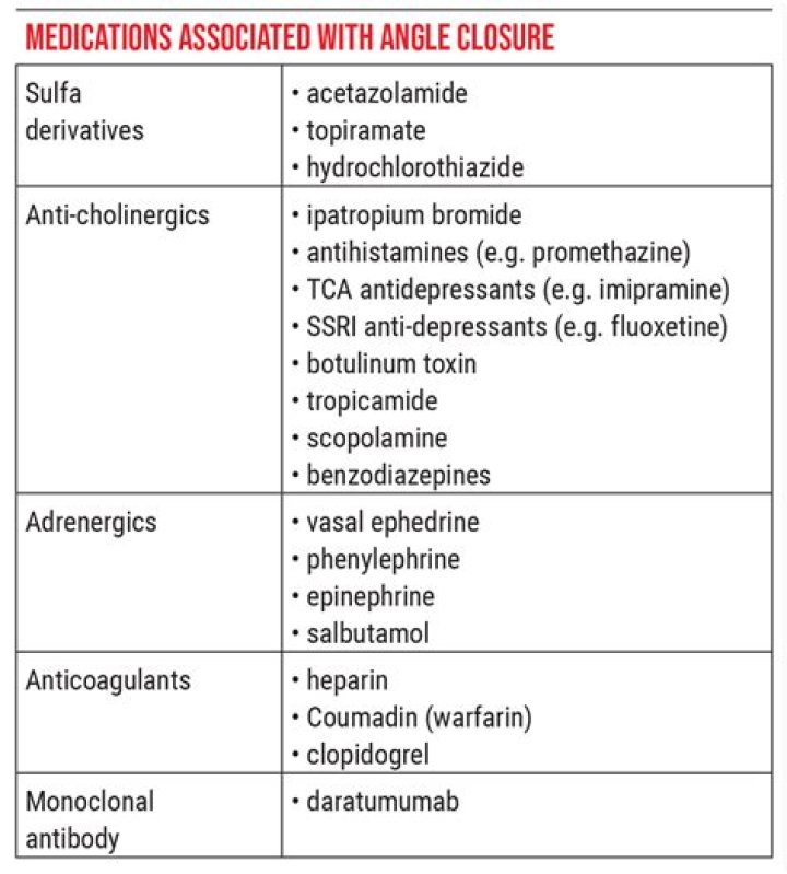 Several types of drugs have the potential to precipitate acute angle closure glaucoma. These include adrenergic, cholinergic and anticholinergic, antidepressants, anticoagulants and sulfa-based agents.