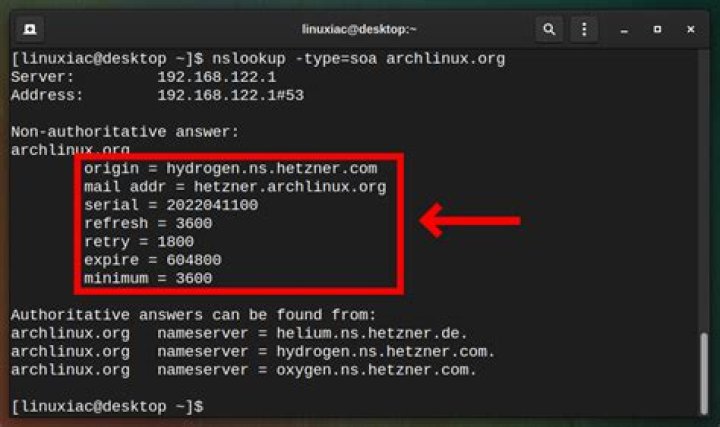 nslookup followed by the domain name will display the “A Record” (IP Address) of the domain. Use this command to find the address record for a domain. It queries to domain name servers and get the details. You can also do the reverse DNS look-up by providing the IP Address as argument to nslookup.