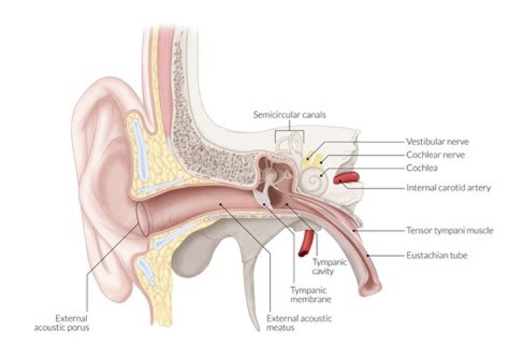 Also known as the tympanic cavity, the middle ear is an air-filled, membrane-lined space located between the ear canal and the Eustachian tube, cochlea, and auditory nerve. The eardrum separates this space from the ear canal. The area is pressurized.