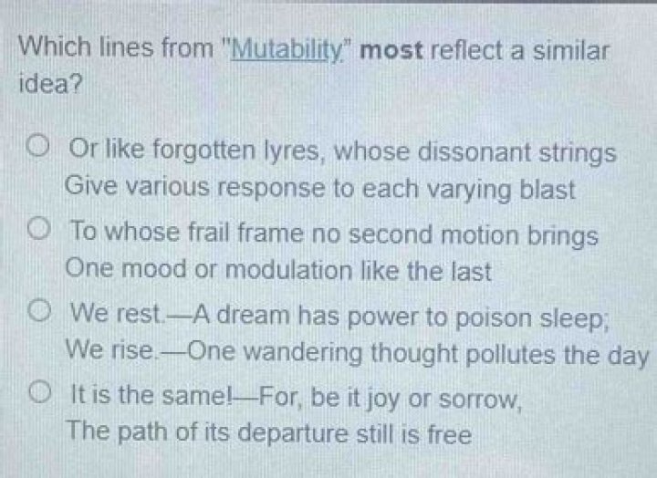 Answer Expert Verified. There are two lines in the poem, “Mutability” that express a similar idea:“We rest. — A dream has power to poison sleep;We rise.