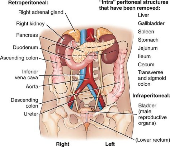 Intraperitoneal: peritonealized organs having a mesentery, such as the stomach, small intestine (jejunum and ileum), transverse colon, liver and gallbladder. Retroperitoneal: organs without a mesentery and associated with posterior body wall, such as the aorta, inferior vena cava, kidneys and suprarenal glands.