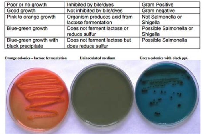 This is a medium that is both selective and differential. The high salt concentration (7.5%) is the selective ingredient. Staphylococcus species, which commonly inhabit human skin, can grow on this high salt concentration (left plate in picture below).