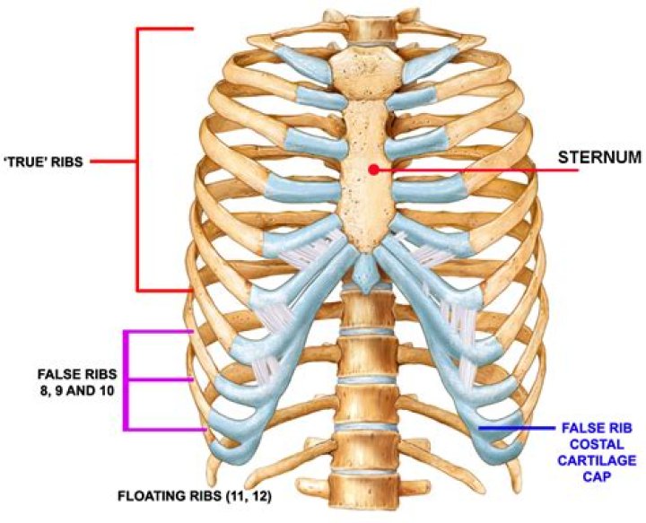 The 8th, 9th, and 10th pairs—false ribs—do not join the sternum directly but are connected to the 7th rib by cartilage. The 11th and 12th pairs—floating ribs—are half the size of the others and do not reach to the front of the body. Each true rib has a small head…