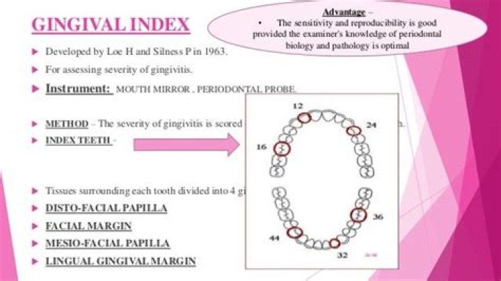 The GI of the individual can be obtained by adding the values of each tooth and dividing by the number of teeth examined. The Gingival Index may be scored for all surfaces of all or selected teeth or for selected areas of all or selected teeth.
