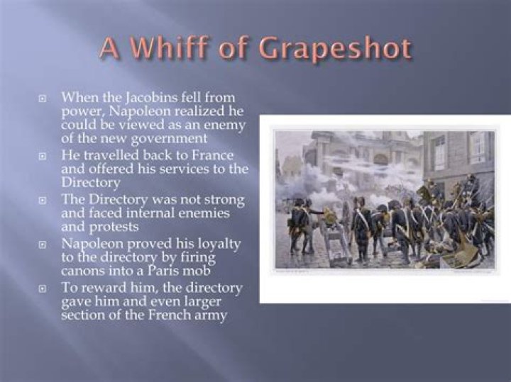 In Oct., 1795, the Convention was assailed by a royalist Parisian uprising, and Paul Barras persuaded the Convention to place Bonaparte in command of the troops. Napoleon dispersed the mob with what he called "a whiff of grapeshot"-which killed about 100 insurgents. He was given command of the army of the interior.