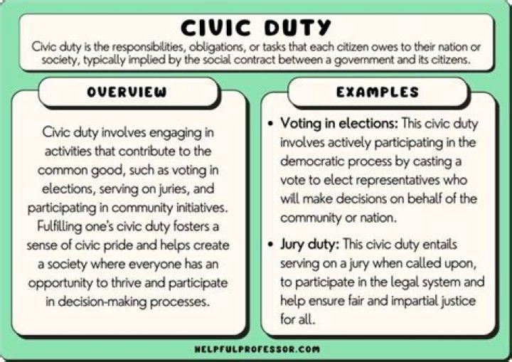 The term civic duty refers to a responsibility expected from all members of a society. It follows the principle that citizens have an obligation to serve their society. In return, they receive certain rights and protections.