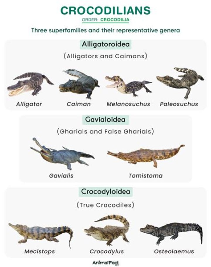 There are 24 recognised species of extant crocodilians, divided into three Families - Alligatoridae (8 species; alligators and caimans), Crocodylidae (14 species; “true” crocodiles) and Gavialidae (2 species; Gharial and Tomistoma).