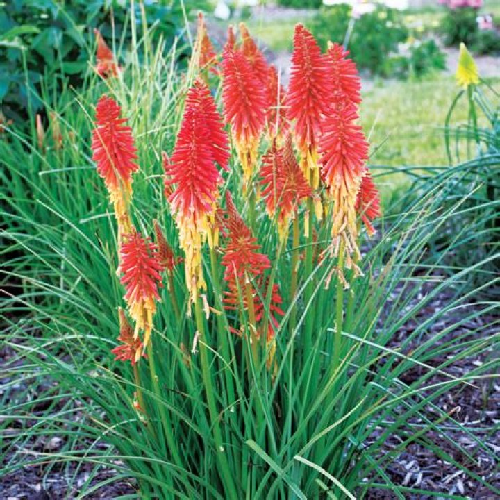 Red hot poker plants form clumps of slender, grass-like foliage. The stems rise above the foliage and bear the long, colorful blossoms. Most cultivars start flowering by late June and some re-bloom until frost.