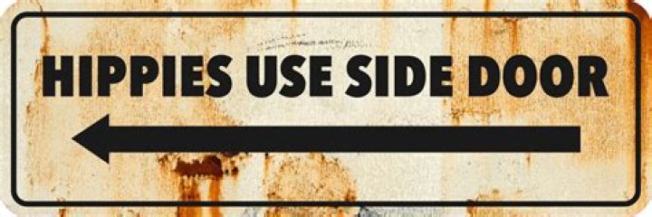 "Hippies Use Side Door” is a sign that has decorated many restaurants in the 2000s, as a piece of joke nostalgia. The Fairview Inn (Talkeetna, Alaska) actually had such a sign in the 1970s—and the side door was kept locked. 'Hippies Use Back Door” ("Hippies Use Backdoor") is a sign that's less frequently used.