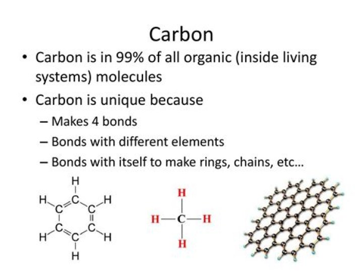 Carbon is unique and found in all living things because it can form up to four covalent bonds between atoms or molecules. These can be nonpolar or polar covalent bonds, and they allow for the formation of long chains of carbon molecules that combine to form proteins and DNA.