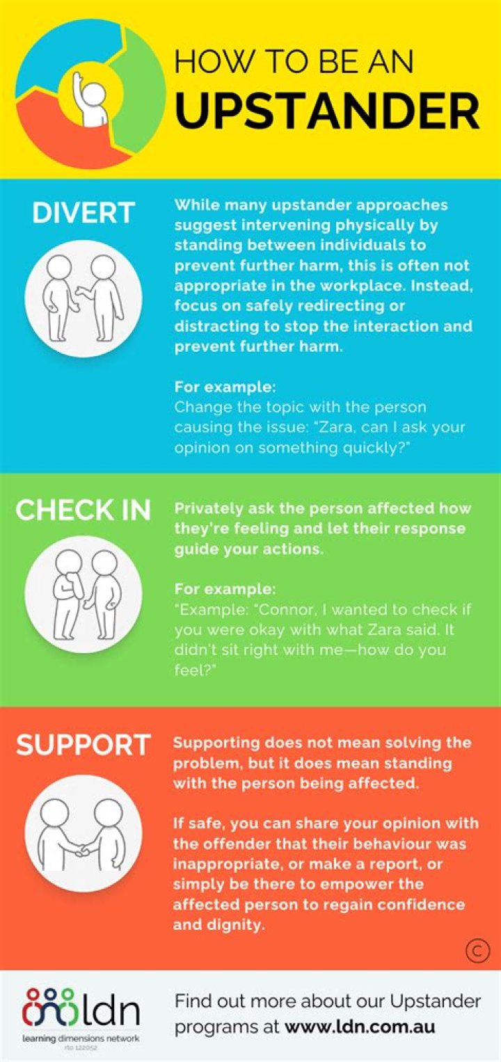 - Direct. Approach either the person being targeted or the person doing the harassing and be direct. ...