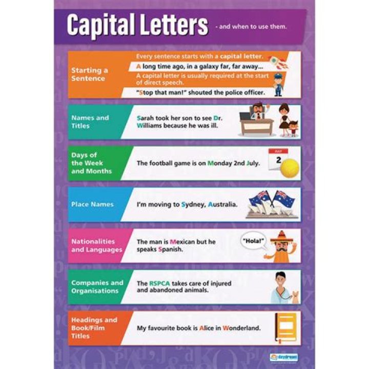 Capital letters, also called upper-case letters, are larger than, and often formed differently from, lower-case letters. Capital letters are used at the beginning of a sentence or a proper name and may be used to show respect.