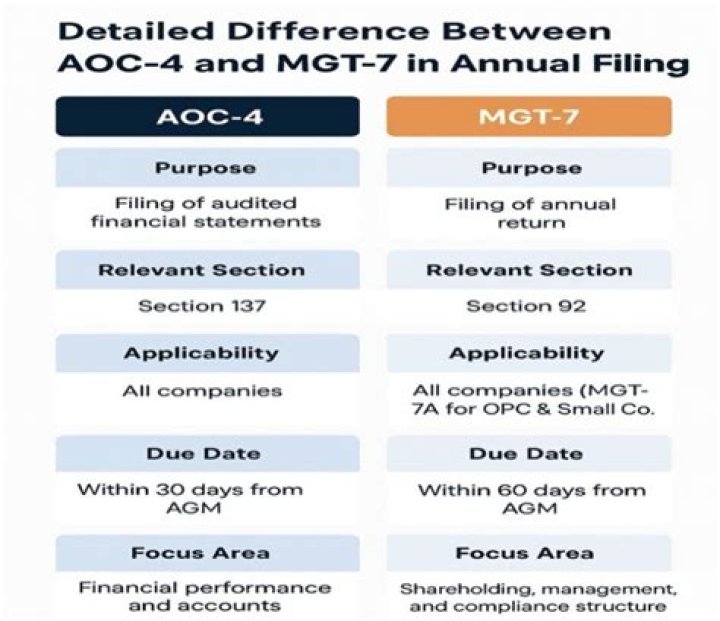 AOC-4 and MGT-7 Annual Compliance for Company are mandatory for each company in India. ... AOC-4 is filing of financial statements, whereas, MGT-7 is an annual return of company.