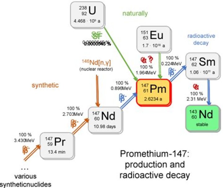 Promethium is the only rare earth, radioactive metal on the periodic table, according to Chemicool. ... It can be produced by bombarding neodymium-146 with neutrons to become neodymium-147, which beta decays over its 11-day half-life into promethium-147, according to the Jefferson Laboratory.