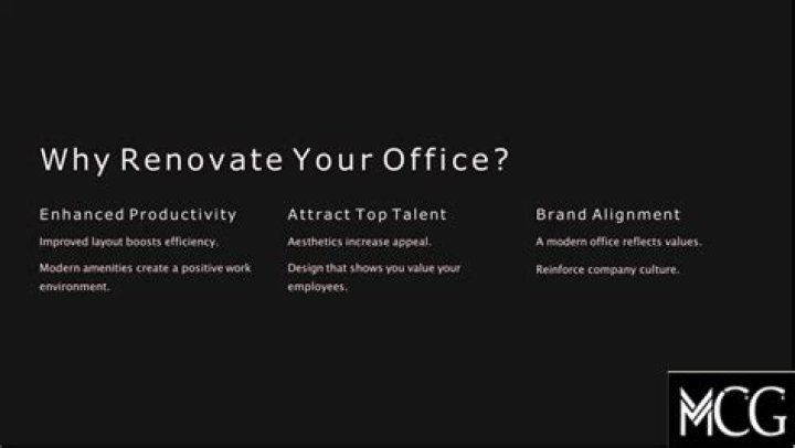 If your business office is looking run down, an office renovation will surely do the trick to breathe a new life into everything. ... New and improved spaces can encourage employee interaction and provide them with a brand-new slate to work on their creativity, and will eventually provide your business with new ideas.