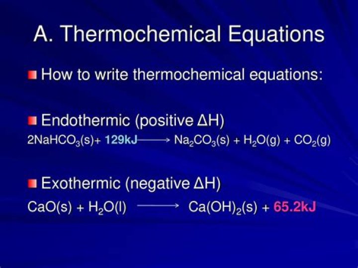 A thermochemical equation is a chemical equation that includes the enthalpy change of the reaction. The process in the above thermochemical equation can be shown visually in the Figure below . (A) As reactants are converted to products in an exothermic reaction, enthalpy is released into the surroundings.