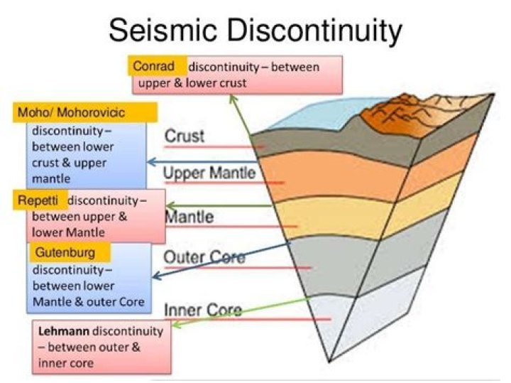 Conrad Discontinuity: Transition zone between upper and lower Crust. Mohorovicic Discontinuity: Transition zone between the Crust and Mantle. Repiti Discontinuity: Transition zone between Outer mantle and Inner mantle. Gutenberg Discontinuity: Transition zone between Mantle and Core.